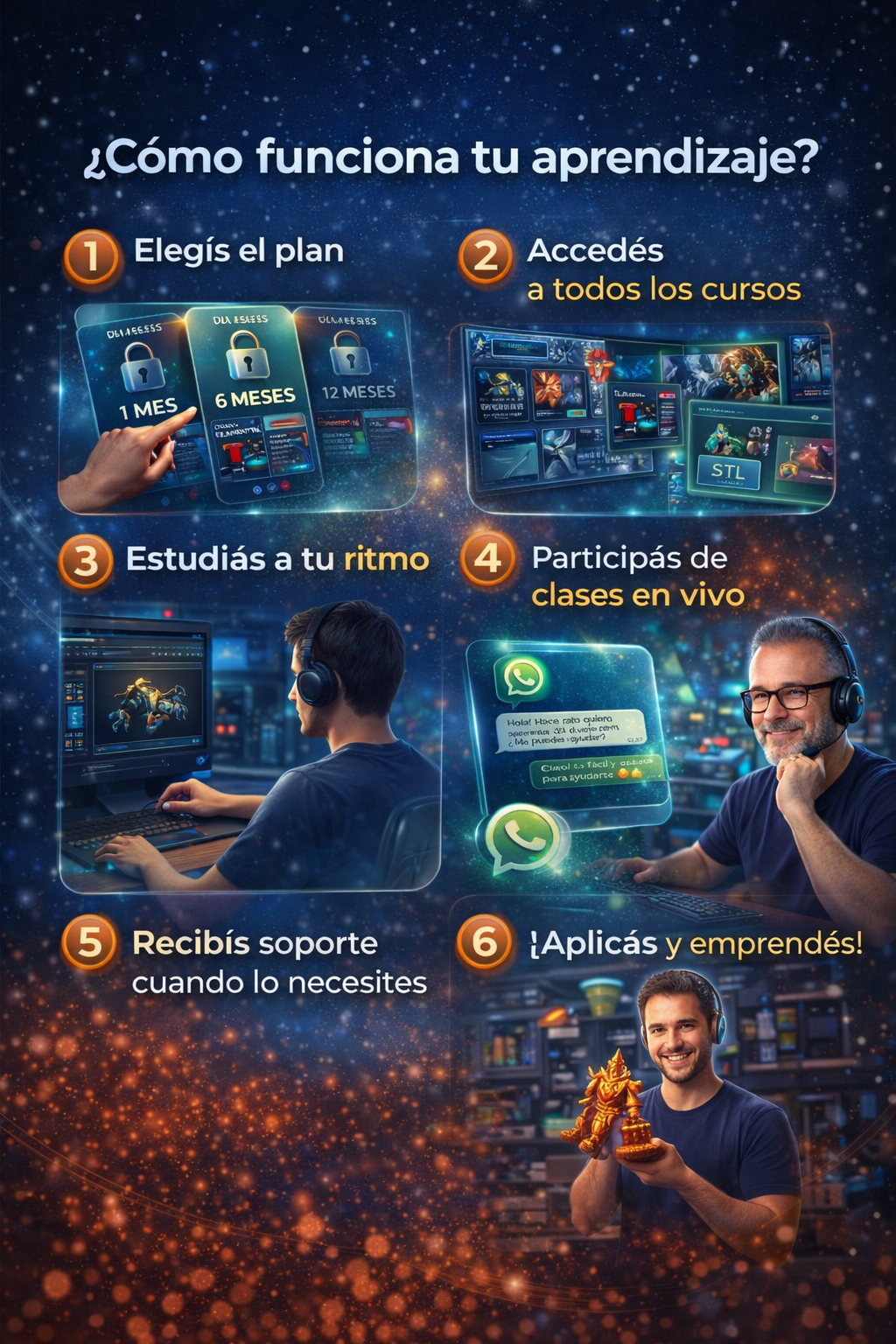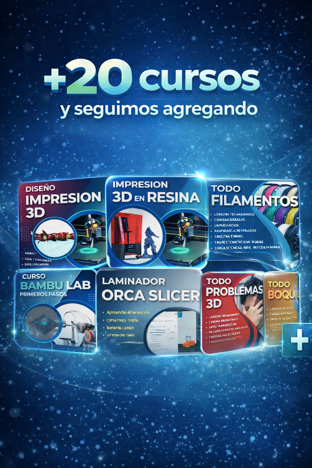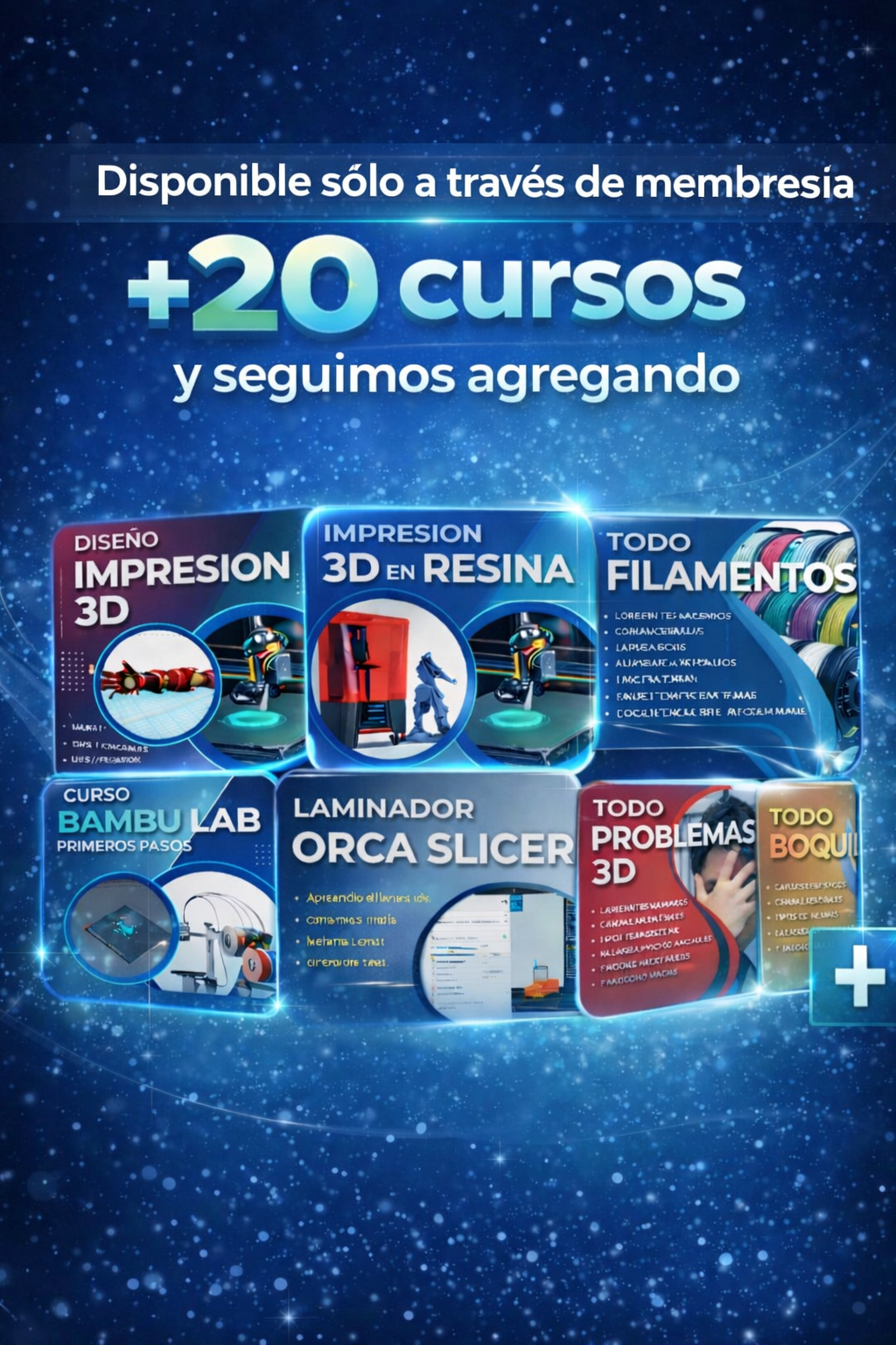 Todo en un solo lugar, sin pagar curso por curso, para que puedas aprender a tu ritmo, volver a ver las clases cuando quieras y seguir creciendo en el mundo de la impresión 3D.